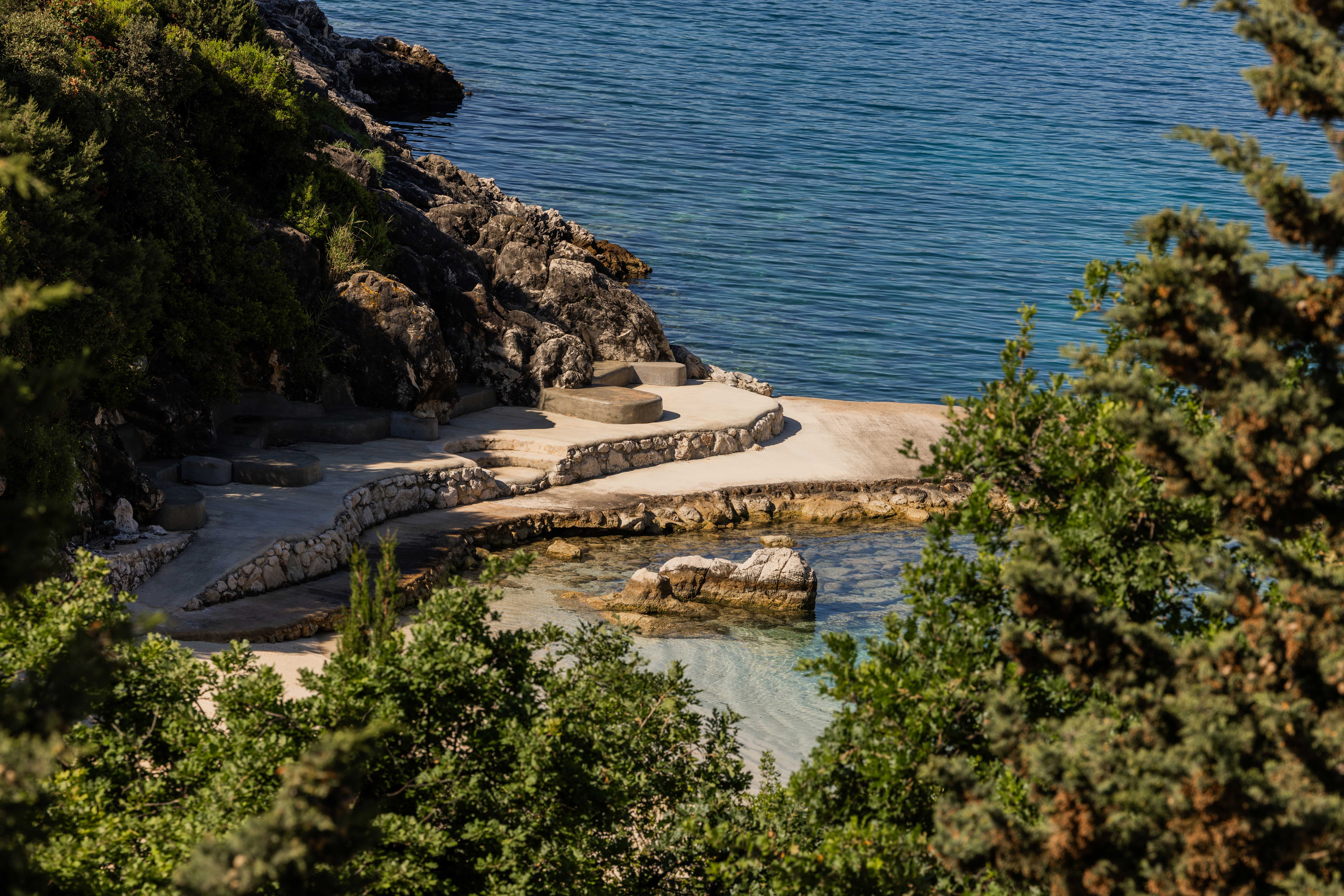 Linen-soft rooms in natural stone and wood. Terraces in shade, private pools that blur into blue. Design that steps back so the view can speak. Morning opens to the terrace; evening gathers under the pines.
