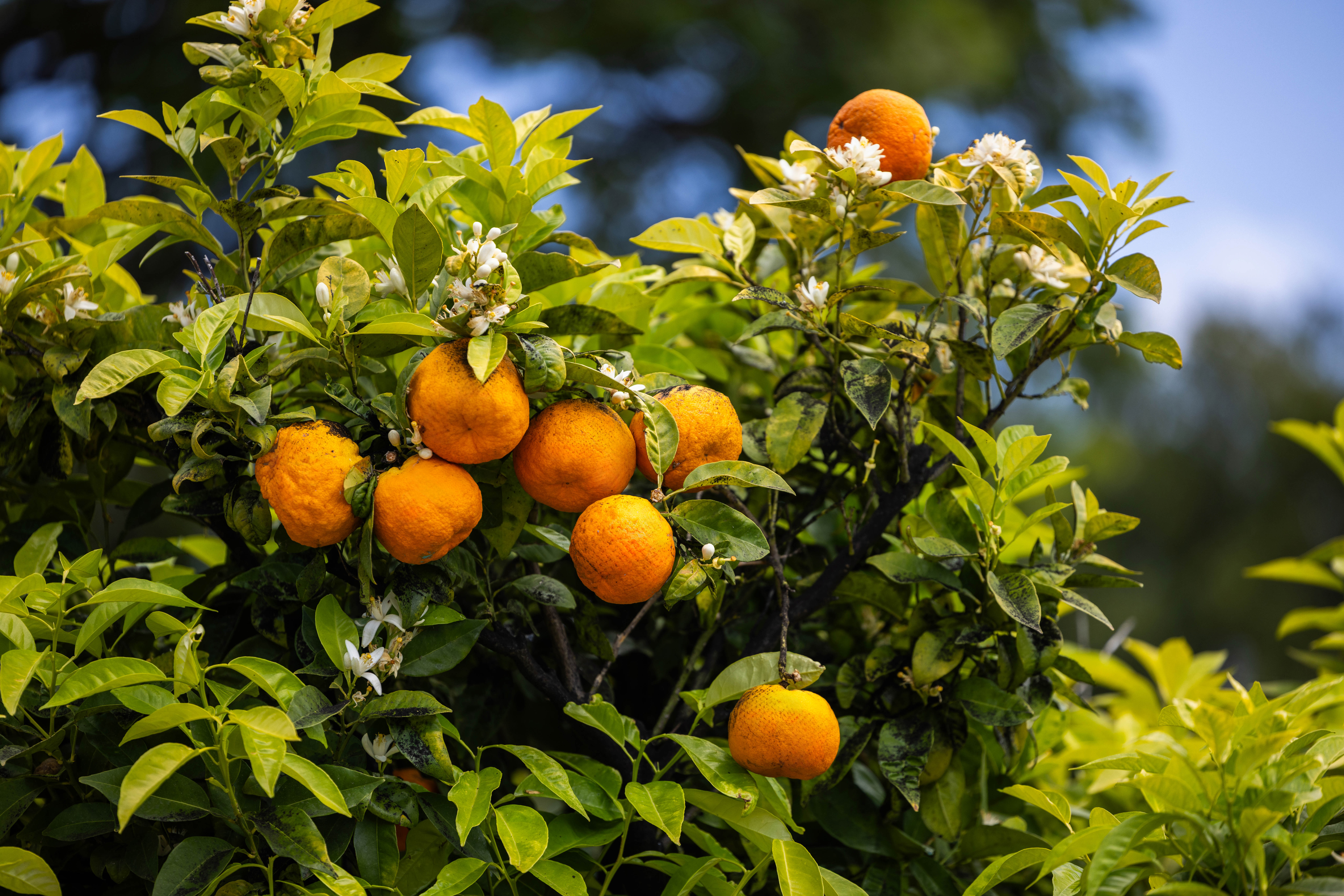 Knobbly, fragrant, generous. The branches hold both blossom and fruit, so the air reads as a recipe: zest, flower, sunlight. Look for them near sun-bathed corners of the gardens.