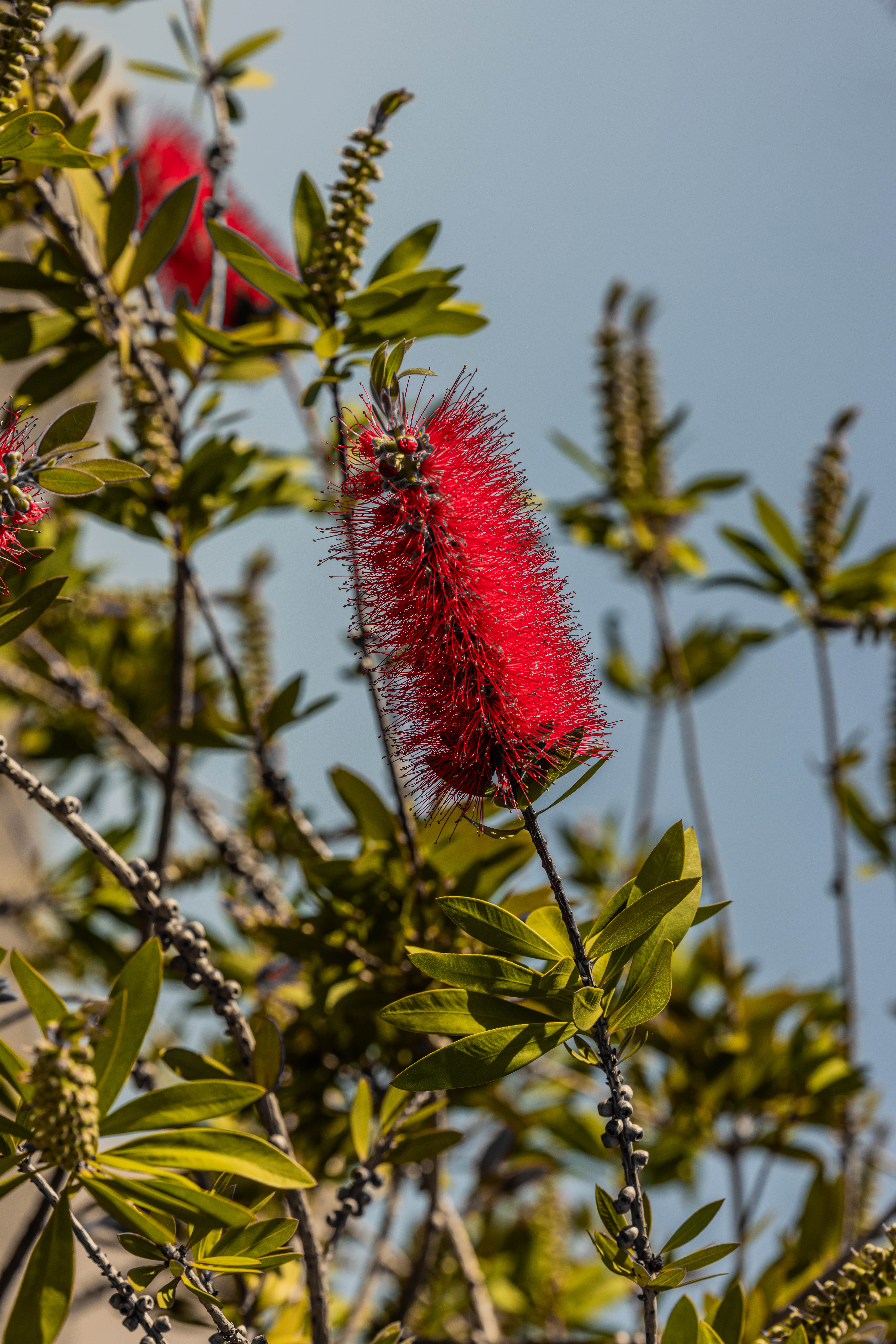 A flash of crimson on slender stems, these “bottlebrush” blooms catch the morning sun like lit fuses. Find them near the paths between villas, where bees work the bristles in soft chorus.