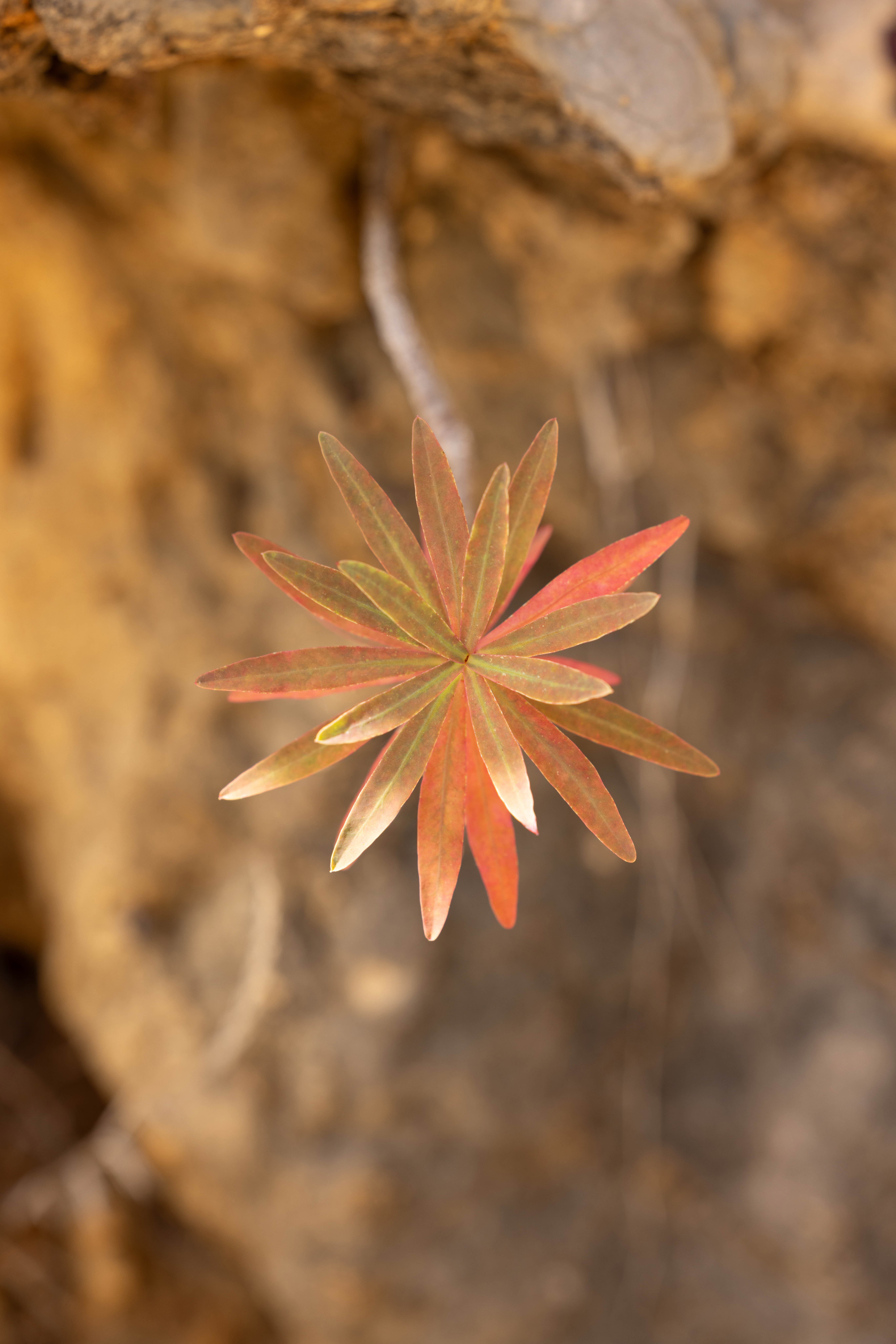 A starry rosette blushed copper, clinging to warm stone. Modest in scale, memorable in form—the kind of detail you notice once, then always.